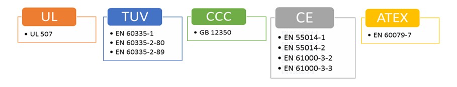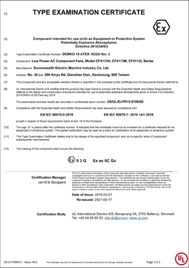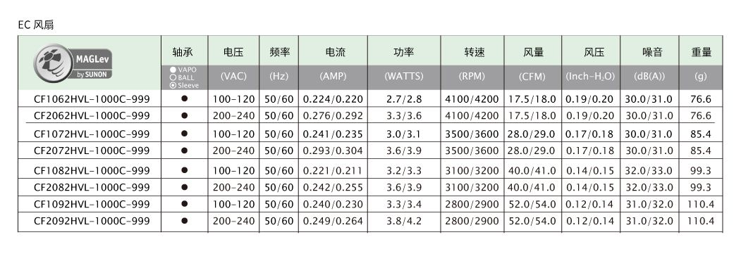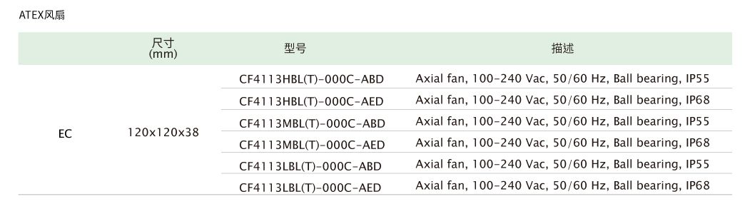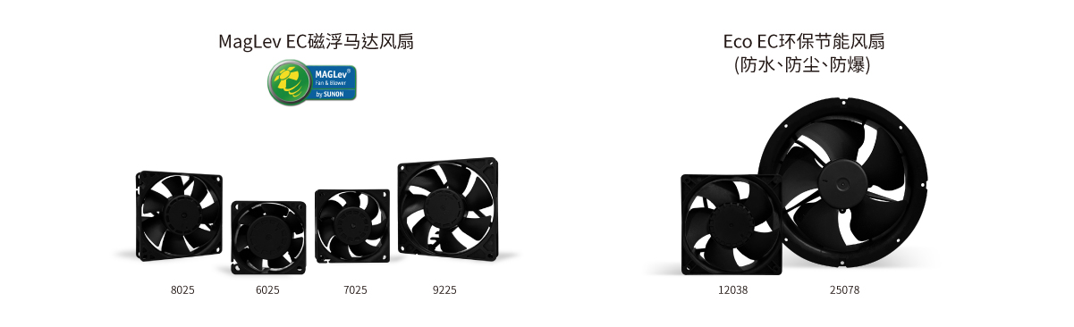 SUNON 交流風扇系列具有風量穩(wěn)定和長效散熱的特性,從60mm~250mm風扇產(chǎn)品廣泛應用于工業(yè)設備、商業(yè)設備、冷凍冷藏、醫(yī)療設備等。近年來在節(jié)能產(chǎn)品發(fā)展趨勢下,也發(fā)展一系列ECO-EC風扇,采用高效馬達搭配各種控制功能,以達到降低能源消耗的設計需求。并可依客戶系統(tǒng)使用于各種嚴苛環(huán)境,提供各種防護等級IP21~IP68防水防塵與ATEX 防爆防護。我們不僅提供專業(yè)的產(chǎn)品服務以保障產(chǎn)品長效使用、安全可靠性,同時提供高質量和高效率的最適化交流風扇解決方案以滿足各產(chǎn)業(yè)的散熱需求。 超省電 全程轉速管控 在交流風扇應用中,暖通空調、冷凍冷藏、工控等設備均需透過各種控制達到最佳效能與節(jié)能的目的,SUNON ECO-EC風扇依應用系統(tǒng)的需求提供不同的控制機制如內建電子回路傳送訊號至客戶系統(tǒng)控制端,隨時偵測散熱風扇的運轉情況;數(shù)字控制(PWM)調速設計,實時調整設備使用當下的最佳散熱狀態(tài),有效減少不必要的能源消耗。 大風量 扇葉優(yōu)化設計 SUNON EC風扇透過專業(yè)的扇葉優(yōu)化設計軟件,仿真優(yōu)化扇葉的曲度和面積,設計各種不同風量與風流的產(chǎn)品。新一代EC 風扇更更大的扇葉曲度設計,提供更集中的風流,也讓氣流吹得更遠,達到風扇整體的散熱效能升級。 長壽命 MagLev 馬達技術 SUNON MagLev EC風扇透過卓越磁浮馬達的垂直磁浮引力系統(tǒng),馬達運轉達到定點定軌的穩(wěn)定運轉軌道,重心穩(wěn)定較不易搖晃震動,減少軸心與軸承接觸摩擦,再配合VAPO軸承技術,材料和結構皆經(jīng)強化處理,改善普遍SLEEVE軸承不耐高溫的缺點,讓風扇達到低振動、低噪音、長壽命的多項優(yōu)點。 MagLev EC風扇應用: 機械設備電控箱、工具機等、醫(yī)療實驗室冷藏設備、商用冷凍冷藏、家用冰箱 高等級IP55 & IP68防水防塵風扇 SUNON提供IP55等級的EC風扇以符合高度潮濕的商用冷凍冷藏系統(tǒng)應用環(huán)境的需求,確保散熱風扇在高度潮濕的應用環(huán)境下還能長時間穩(wěn)定運作。另外,SUNON的IP68 EC風扇能應用在戶外嚴苛氣候的設備環(huán)境如儲能系統(tǒng)、戶外充電站系統(tǒng),不受鹽霧侵蝕保障散熱風扇可長效運作,SUNON可依客戶系統(tǒng)環(huán)境提供最適化高IP防護的EC風扇散熱方案。 風扇應用: 儲能系統(tǒng)、戶外充電站系統(tǒng)、商用冷凍冷藏系統(tǒng) 防爆ATEX新技術 SUNON防爆AC和EC風扇已取得歐盟ATEX防氣爆認證,亦提供客制化ATEX粉塵爆防護設計服務,能在具潛在爆炸風險的應用環(huán)境范圍內,直接對電氣設備的使用提供適當有效的安全裝置保護力。 環(huán)境永續(xù)意識抬頭,傳統(tǒng)冷藏設備使用的HCFC系列冷媒中的氟氯碳化物會破壞臭氧層,已遭各國禁用或減量使用。新世代冷藏設備陸續(xù)轉型,無氟的環(huán)保冷媒逐漸取代傳統(tǒng)冷媒,由于環(huán)保冷媒多為碳氫鹵化物,在常溫常壓下性質穩(wěn)定不易起火燃燒,但在不同的環(huán)境條件下仍具有爆炸的危險性,SUNON的防爆風扇可符合新世代的冷藏系統(tǒng)的使用安全需求。 同時,散熱風扇具備防爆安全性是國際市場的必要條件,SUNON防爆風扇具備無火花防護性*,可應用在具潛在爆炸風險的應用環(huán)境如儲能和能源轉換設備系統(tǒng),當能源系統(tǒng)異常時,可避免造成相關能源系統(tǒng)的損壞或引爆疑慮。另外,SUNON散熱風扇應用在各式工業(yè)制造產(chǎn)業(yè)內的多數(shù)電氣儀器和設備如金屬切割廠等制程,都有可燃粉塵爆炸性的危險,SUNON提供客制化ATEX粉塵爆防護設計服務,保障客戶終端產(chǎn)品的運作質量及使用上安全無虞。 風扇應用: 儲能系統(tǒng)、能源轉換系統(tǒng)、商用冷藏設備工、業(yè)制造業(yè) 高安全可靠度 符合多項國際安全規(guī)范認證 SUNON EC產(chǎn)品銷售各大洲,深知散熱方案使用安全的重要性,為提供海外客戶具高質量防護且無危害性的散熱方案,SUNON EC風扇取得多項國際安規(guī)認證項目以符合各海外市場對于輸入產(chǎn)品安全的規(guī)范。 風扇品質優(yōu)化 SUNON EC風扇扇葉采用最適化的材料強度以符合不同應用系統(tǒng)環(huán)境溫度的需求,同時強化整體扇葉結構,以確保產(chǎn)品高可靠度。另外,SUNON因應客戶系統(tǒng)不同電壓需求采用泛用型電壓設計(90V~254V),風扇內建自動調節(jié)芯片不再需要考慮不同輸入電壓問題,提供客戶系統(tǒng)端的應用便利性。 恒溫性&溫度保護設計 SUNON EC風扇符合商用冷藏設備的適用溫度(-25℃~+70℃),亦提供應用在超低溫的商用冷柜環(huán)境(-40℃)的EC風扇方案,穩(wěn)定散熱以保障冷凍速度快。 SUNON提供多項EC風扇保護設計以確保高質量可靠性,在考慮不同應用環(huán)境的電源穩(wěn)定性,風扇內建電子回路可偵測到系統(tǒng)溫度過高或異常,風扇將自動降低轉速運轉甚至主動停止,避免風扇因過熱而損壞,當故障排除后將恢復正常運作。同時,依客戶端較高溫的應用操作環(huán)境如,SUNON EC風扇馬達通過具備絕緣等級F級* (材料零件容許最高溫度為155度)的保護力,確保內部材料不受高溫影響而老化損壞。 SUNON EC風扇系列 應用產(chǎn)業(yè)